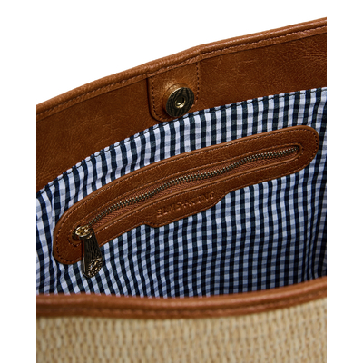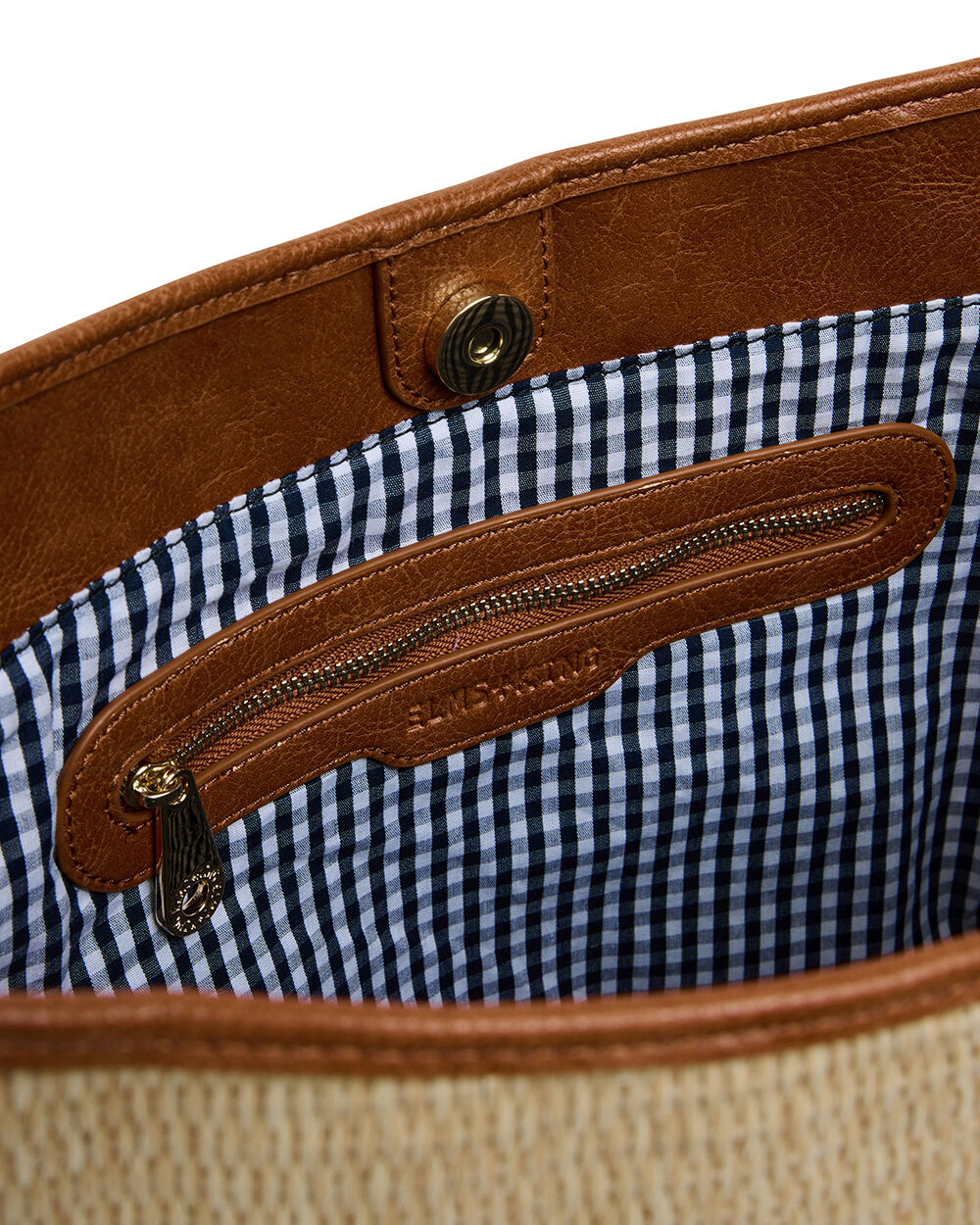 The Elms + King Arcadia Tote is made from premium 100%recycledpolyurethaneand features a blue & white gingham lining. The Arcadia is a relaxed tote bag with classic hobo styling. The roomy interior is secure with a top mounted mag closure, which opens to reveal an ample centre compartment with zippered pocket.