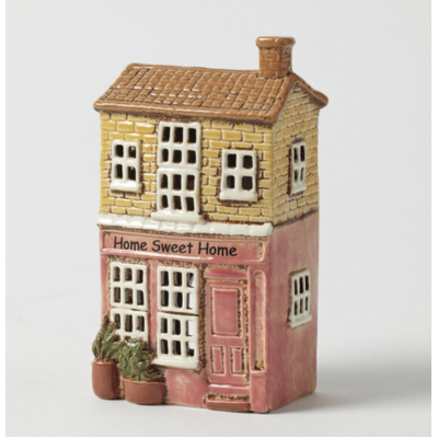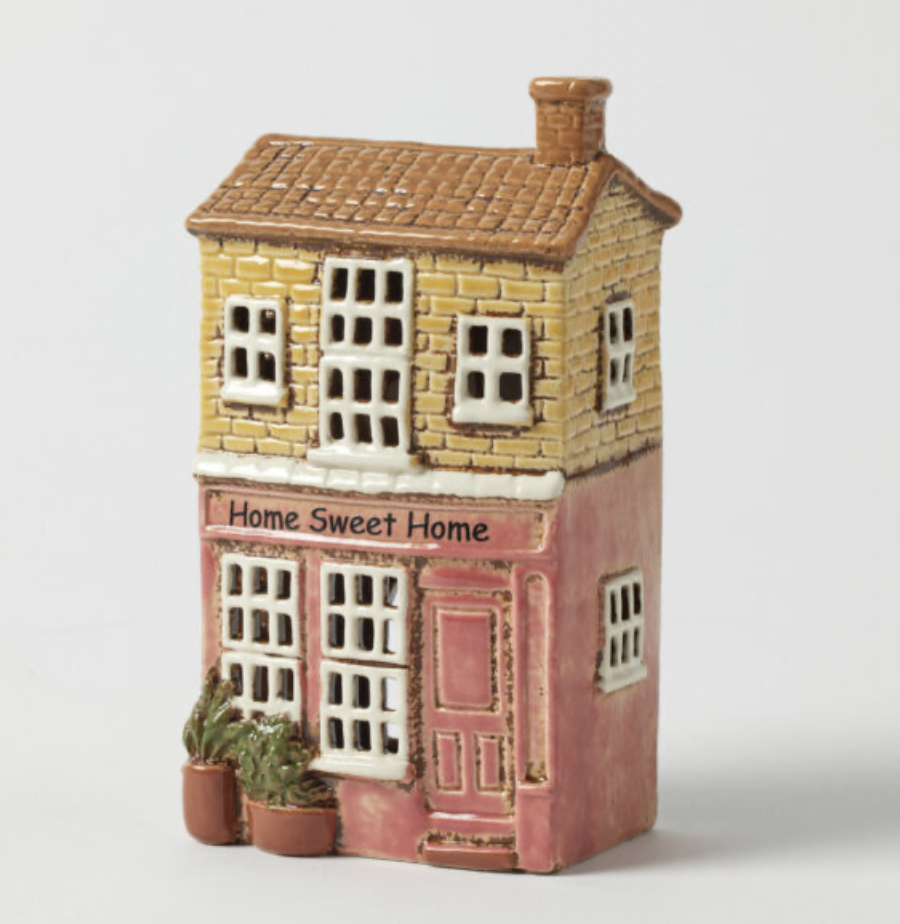 Designed to capture the cosy appeal of European village homes, this hand painted stoneware design has a welcoming townhouse feel. Lovely as a decorative piece or used as a tealight holder, it features blush and honey tones, brick detailing and potted greenery that create an inviting presence on shelves and tabletops. When lit, candlelight softly glows through the windows, with gentle smoke floating from the chimney for an atmospheric finish. Candle not included.