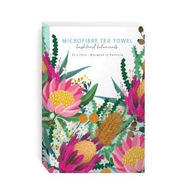 Microfibre tea towel showcasing striking proteas, golden banksias and other native Australian flora on a beautiful soft blue base.