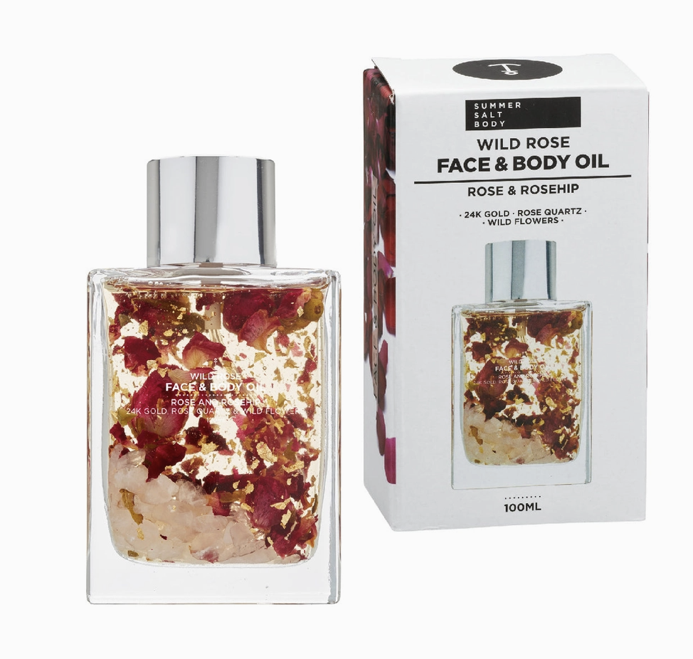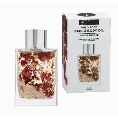 24K GOLD - WILD FLOWERS - ROSE QUARTZ Our Wild Rose Oil will deeply hydrate and rejuvenate your skin. Steeped in rose buds & rose petals, positively charged Rose Quartz as well as 24K Gold Leaf to turn everyday routine into blissful daily rituals. Rich in antioxidants as well as Vitamins C & E to nourish and protect while providing your skin with a natural glow.