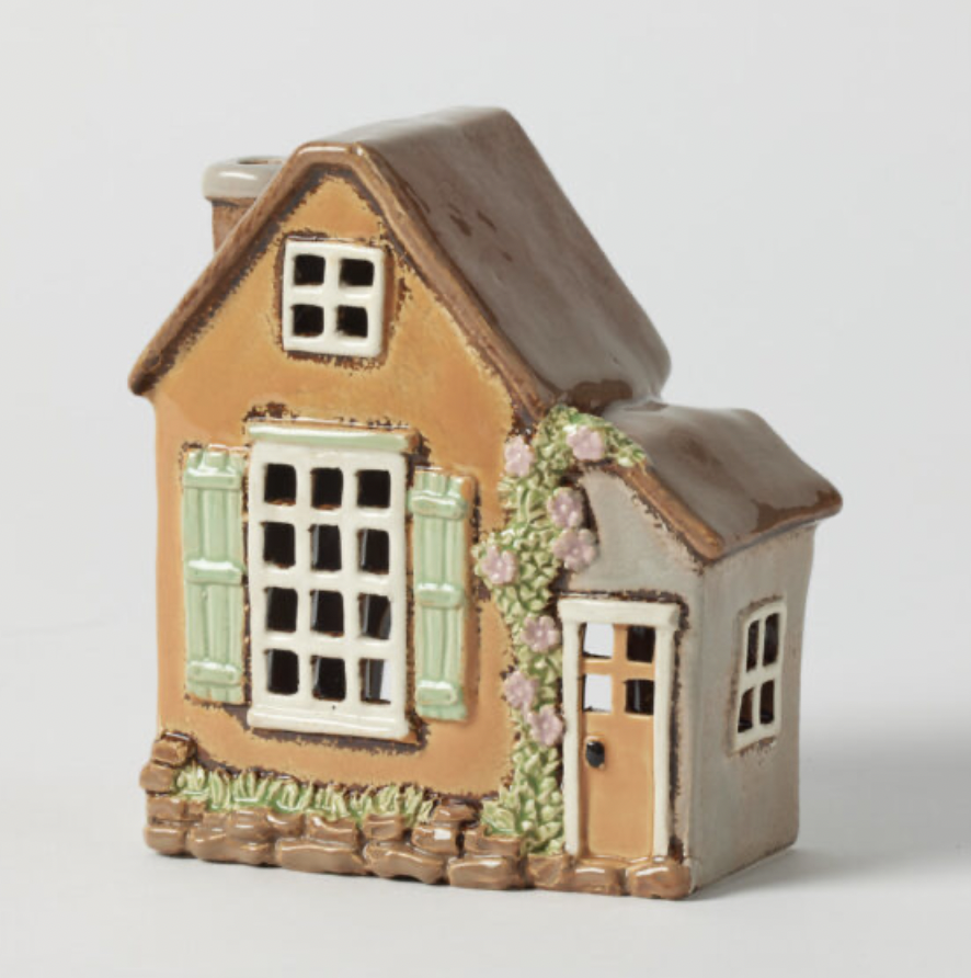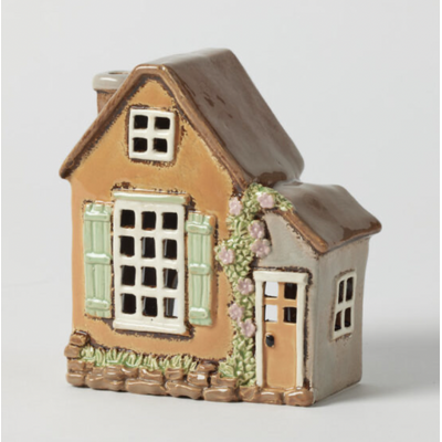 Inspired by the charm of English village cottages, the Sussex House Tealight Holder is a hand painted stoneware design with a warm, traditional feel. Beautiful as a decorative accent on its own or used as a tealight holder, it features soft ochre tones, green shutter detailing, a pitched roof and climbing florals that bring character and a gently rustic look to shelves and tabletop displays.