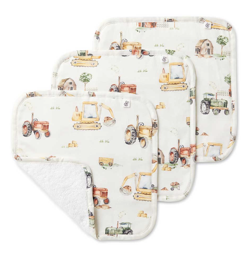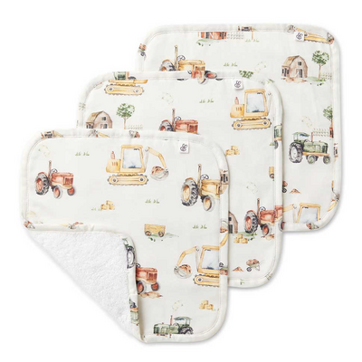 We have designed these unique wash cloths with jersey organic cotton on one side and organic terry towelling on the other side. The jersey side features our exclusive Snuggle Hunny Diggers & Tractors print.