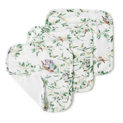 We have designed these unique wash cloths with jersey organic cotton on one side and organic terry towelling on the other side. The jersey side features our exclusive Snuggle Hunny Eucalypt print.