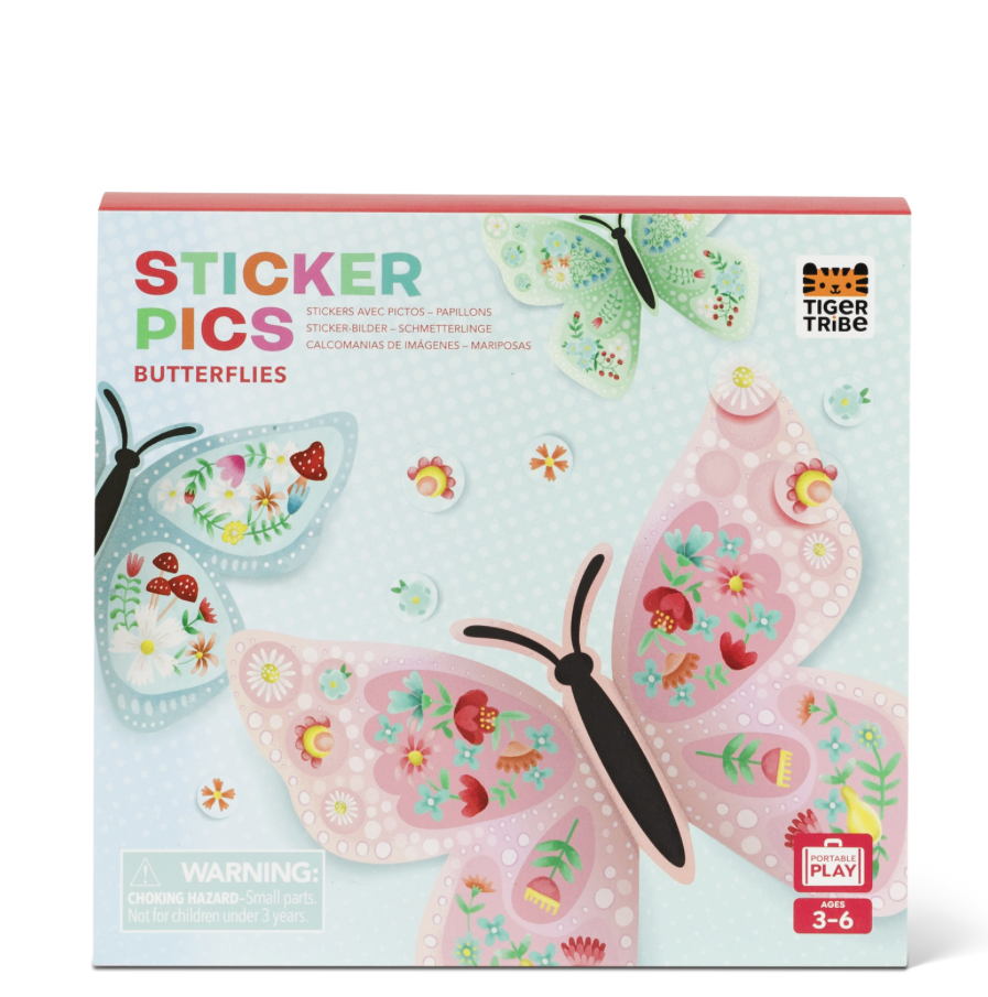 Tiger Tribe’s Sticker Pics - Butterflies is a super easy crafting activity that you can take anywhere, because there is no mess. With six beautiful 3D butterfly templates and three sheets filled with full colour floral stickers — create a kaleidoscope of fluttery butterflies to stick on your wall.