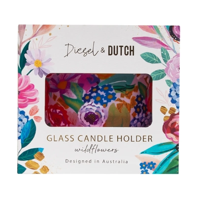 Handmade glass tea light holder featuring a striking floral arrangement of beautiful wildflowers in full bloom with magnificent colours and textures.